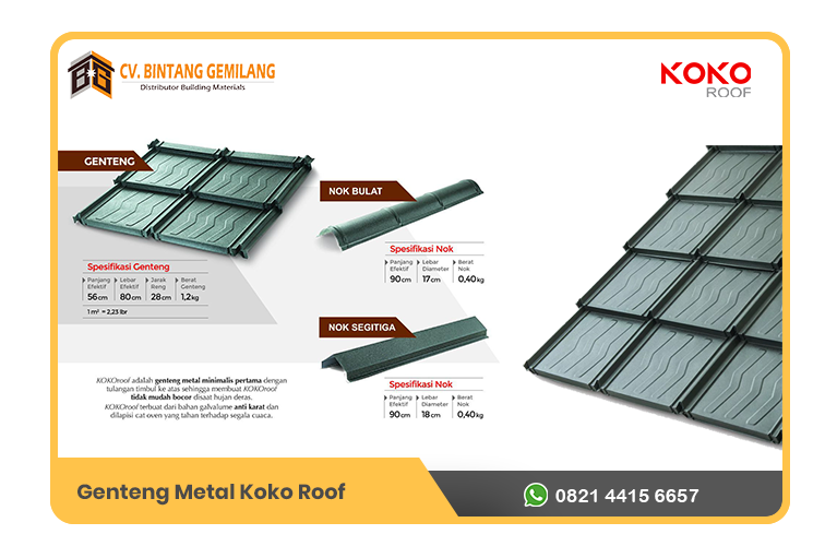 Genteng Metal Koko Roof Merupakan suatu produk genteng minimalis inovasi terbaru perkembangan produk atap yang memiliki desain modern pertama dengan rusuk timbul. Genteng metal minimalis ini terbuat dari bahan baku Alumunium Zinc. Sesuai dengan namanya produk ini didesain dengan bentuk minimalis dan juga elegant, mengunggulkan segi estetikanya saat dipasang.